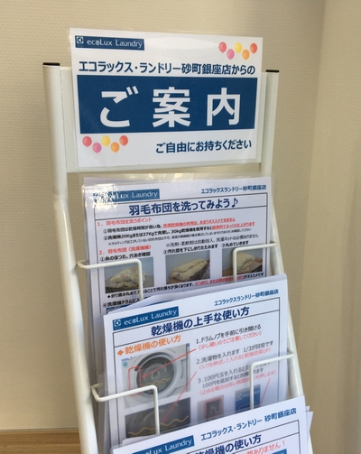 当店入り口付近に“洗濯機の使い方から羽毛布団の洗い方”等のチラシがございます、コインランドリーが初めて利用の方でも心配ありません。